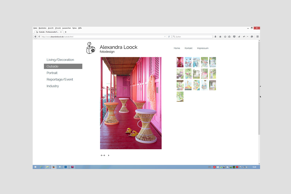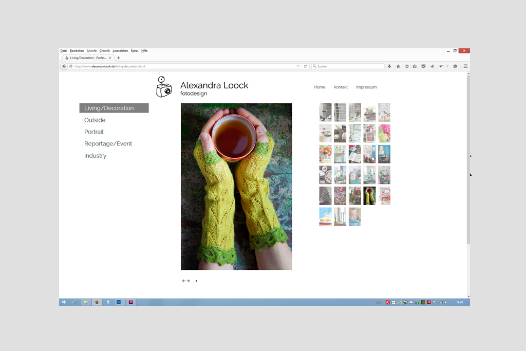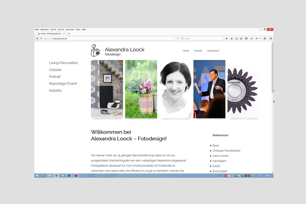 Alexandra Loock ist eine ausgebildete Werbefotografin und hat mich beauftragt für Sie eine Website zu gestalten und einzurichten. Mit Hilfe eines CMS und einem FTP-Zugang kann Sie den Content ihrer Website selber pflegen und erweitern.