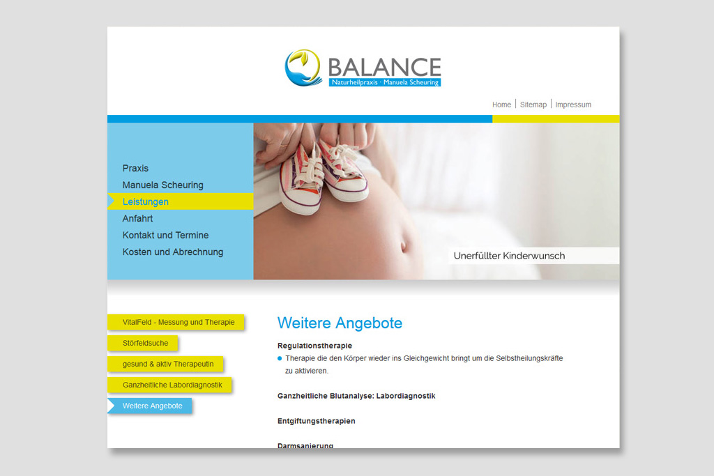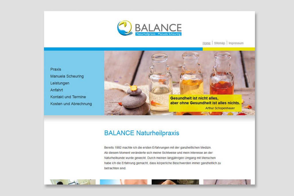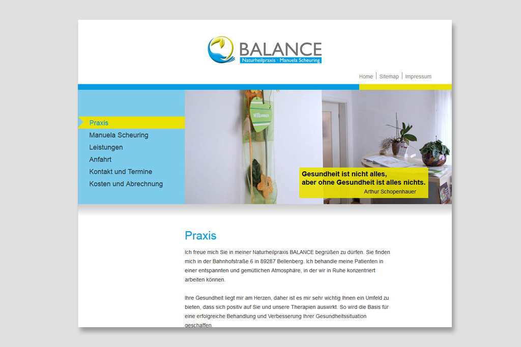 Die Gestaltung der Naturheilpraxis BALANCE wurde von einer Kollegin von mir entworfen. Das zu Grunde liegende Design habe ich bei der Umsetzung der Homepage von Manuela Scheuring berücksichtigt und mich strikt danach gerichtet. In enger Zusammenarbeit mit der Heilpraktikerin Manuela Scheuring haben wir die Inhalte und Bildauswahl besprochen und umgesetzt.