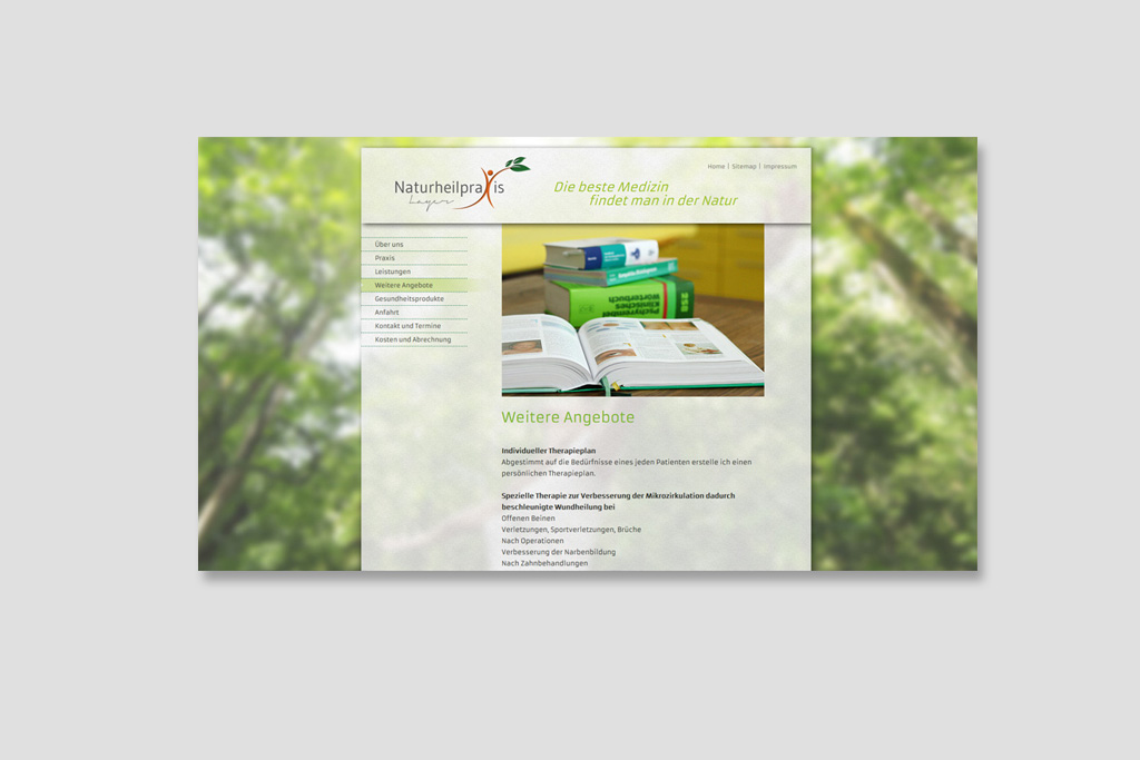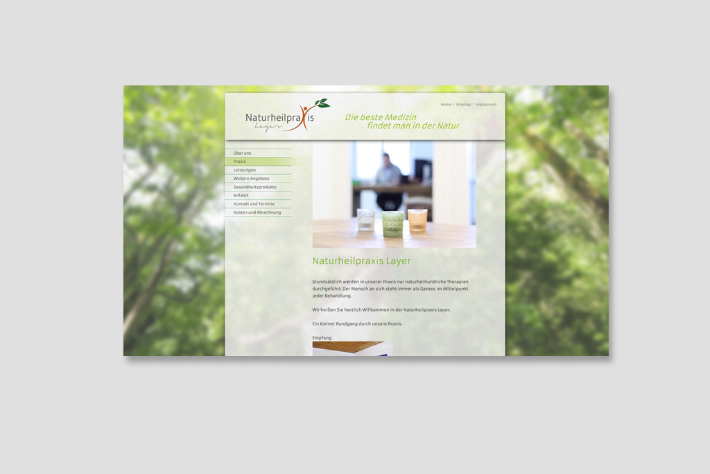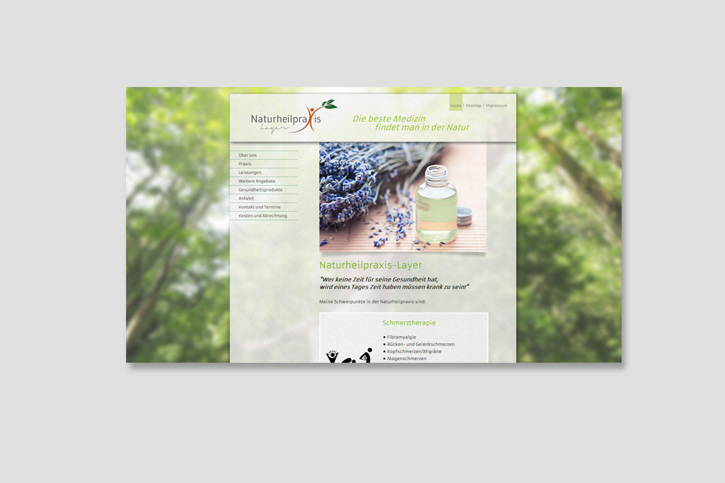 Der Naturheilpraktiker Ralf Layer nahm mit mir im Zuge seiner Praxiseröffnung Kontakt auf. Dank seiner langfristigen Planung hatte wir genügend Zeit uns kreative Gedanken über die Gestaltung seiner Homepage zu machen. An dem Design wurde konsequent gearbeitet und eine Fotografin erstellte noch wunderschöne Bilder, die das gesamte Design abrundete.
